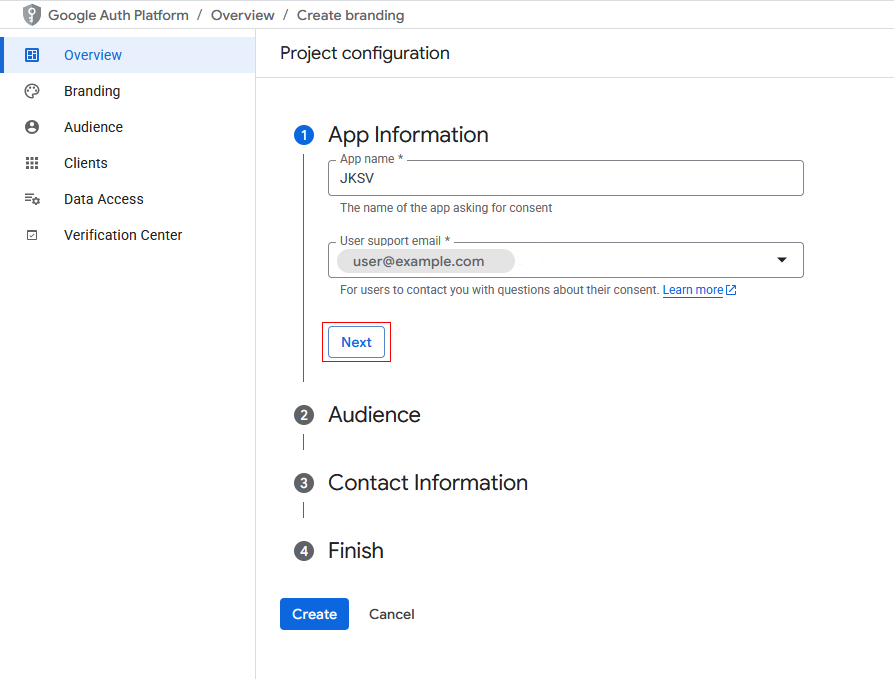 JKSVfor the app name alongside the user support email (the email of the Google account you're currently using) and clickNext.