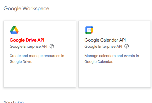 + Enable APIs and services, scroll toGoogle Workspace, selectGoogle Drive API, and clickEnable.