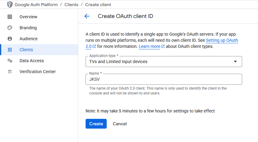 Application TypetoTVs and limited input devices, then set the name for the client (can be anything, the nameJKSVis used in this guide).