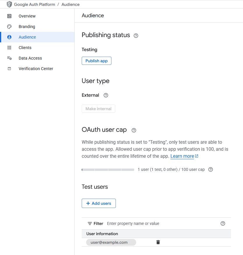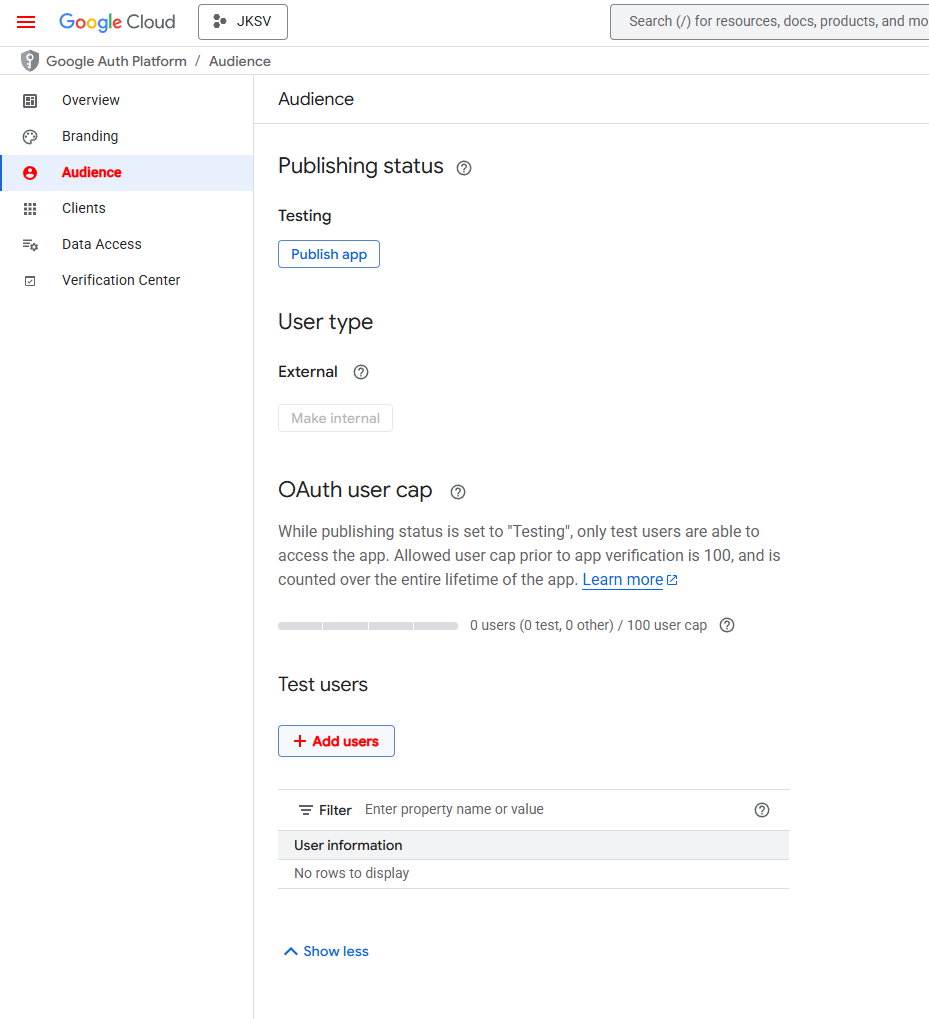 Navigation menu→APIs & Services→OAuth consent screen→Audience.Click